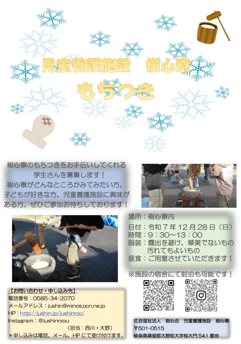 2025年10月27日 もちつきイベント開催! 申込みは下記ボタンからフォームをご利用いただくか、お電話・メールでも受け付けています。 ↓ 12月28日 もちつきイベント〈申し込みフォームはこちらから〉 前の記事樹心寮×学生つどいカフェ開催 次の記事令和8年3月24日 施設見学会開催
